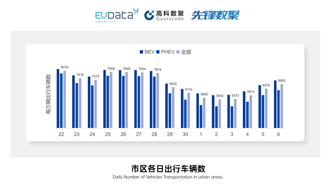 细分至各日出行强度来看,节前工作日出行强度约为每万辆出行车辆数8000辆(如9月22日、9月25日至9月28日),节前休息日约7300辆;节中出行强度呈现了U字形走势,从9月29日的6622辆逐渐下降到10月2日的最低点5545辆,随后逐渐回升到10月6日的6902辆。市区BEV和PHEV的出行强度均展现了一致的趋势,且BEV在各日出行强度均高于PHEV。