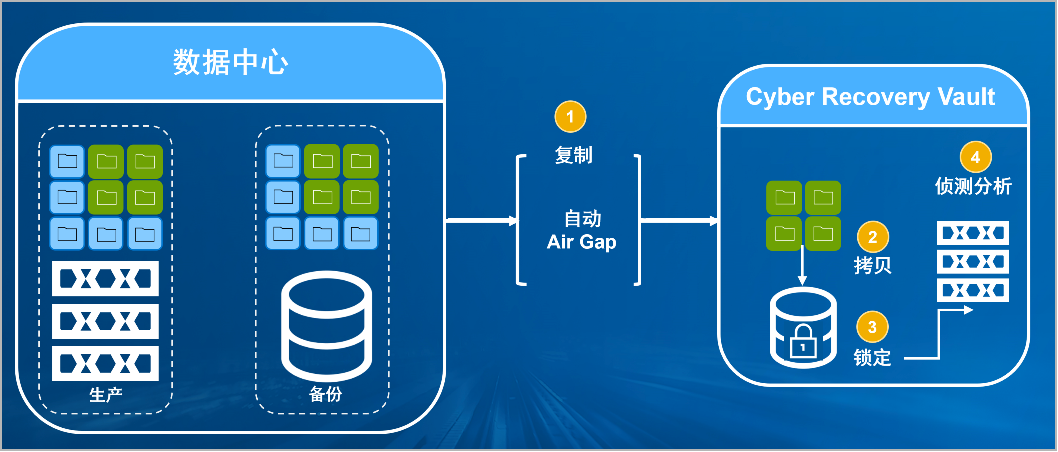 PA视讯官网防勒索病毒方案将生产中心备份数据复制到Vault区,复制后网络自动断开实现弹性隔离。Vault区的数据快速拷贝,并对拷贝版本加锁(在锁定期数据不允许删除和修改)。Vault沙箱内对拷贝版本进行扫描分析,验证数据是否完好。